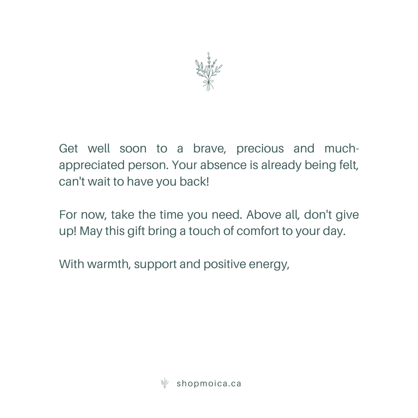 Get well soon to a brave, precious and much-appreciated person. Your absence is already being felt, can't wait to have you back! For now, take the time you need. Above all, don't give up! May this gift bring a touch of comfort to your day. With warmth, support and positive energy,